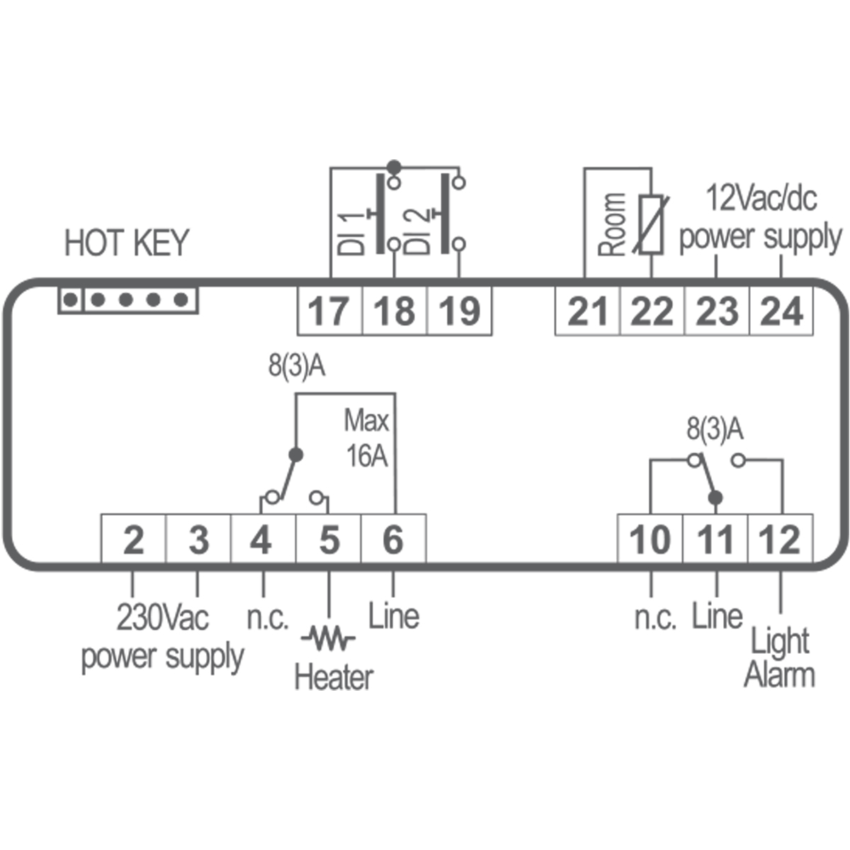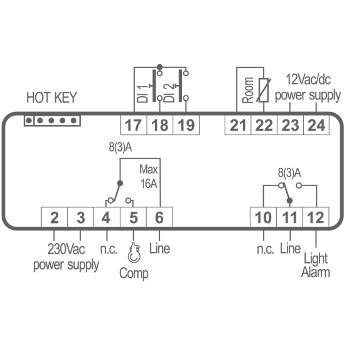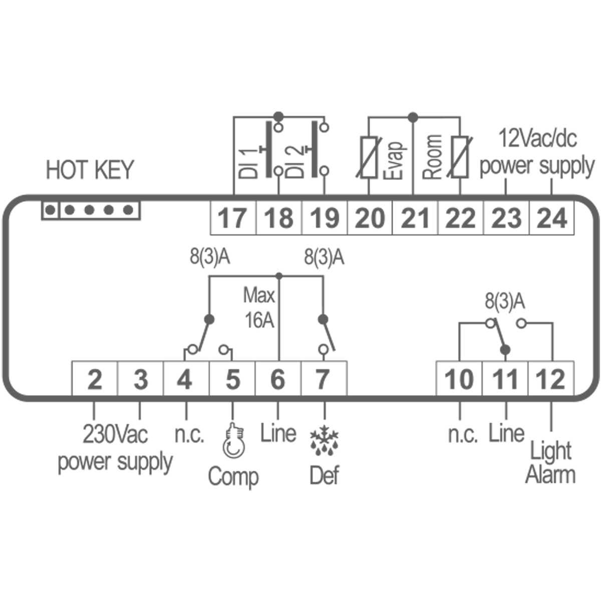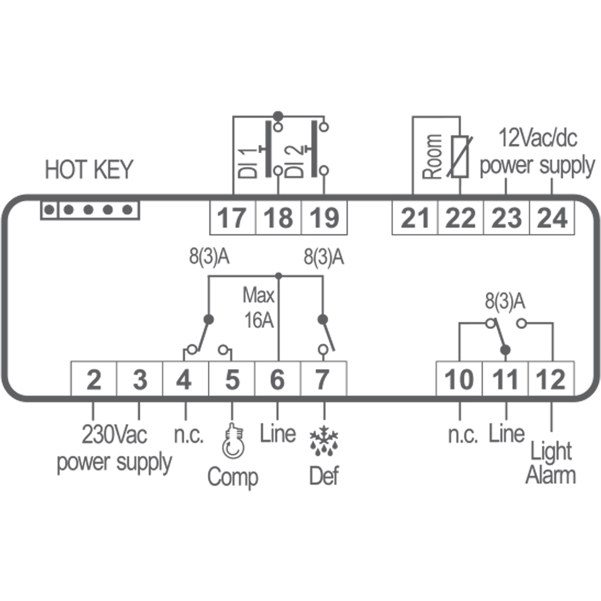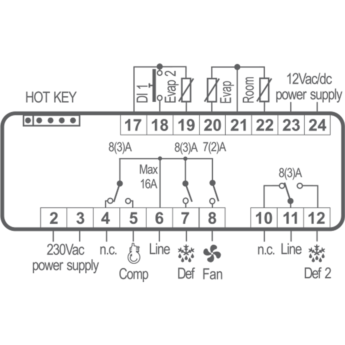 Entwickelt zum Ersetzen von über 150 Reglern zum Kühlen/Heizen im Format 32x74mm Schnelle, einfache und intuitive Installation Schnelles Set-up in nur 3 Schritten Doppelte Stromversorgung 12Vac/dc und 230Vac Spezielle Funktionen für Anwendungen mit zwei Verdampfern Automatische Erkennung der angeschlossenen Fühler Vollständige Steuerung des Verflüssigers Einfache und schnelle Programmierung mit Hot Key oder Prog Tool Kit Leistungsaufnahme 3VA Display mit roten LED mit 10,5mm Höhe und Symbolen 7 mit Parametern voreingestellte Konfigurationen tC tC1 = Thermostat an/aus – Kühlung tC2 = Thermostat mit Abtauung über Verdichterstopp tC3 = Thermostat mit zeitgesteuerten Abtauzyklen tC4 = Thermostat mit Abtauzyklen und Temperaturkontrolle am Ende der Abtauung tC5 = Thermostat mit Abtauzyklen und Temperaturkontrolle am Ende der Abtauung und Verdampfergebläse tC6 = Thermostat für Anwendungen mit zwei Verdampfern tC7 = Thermostat an/aus – Heizung
