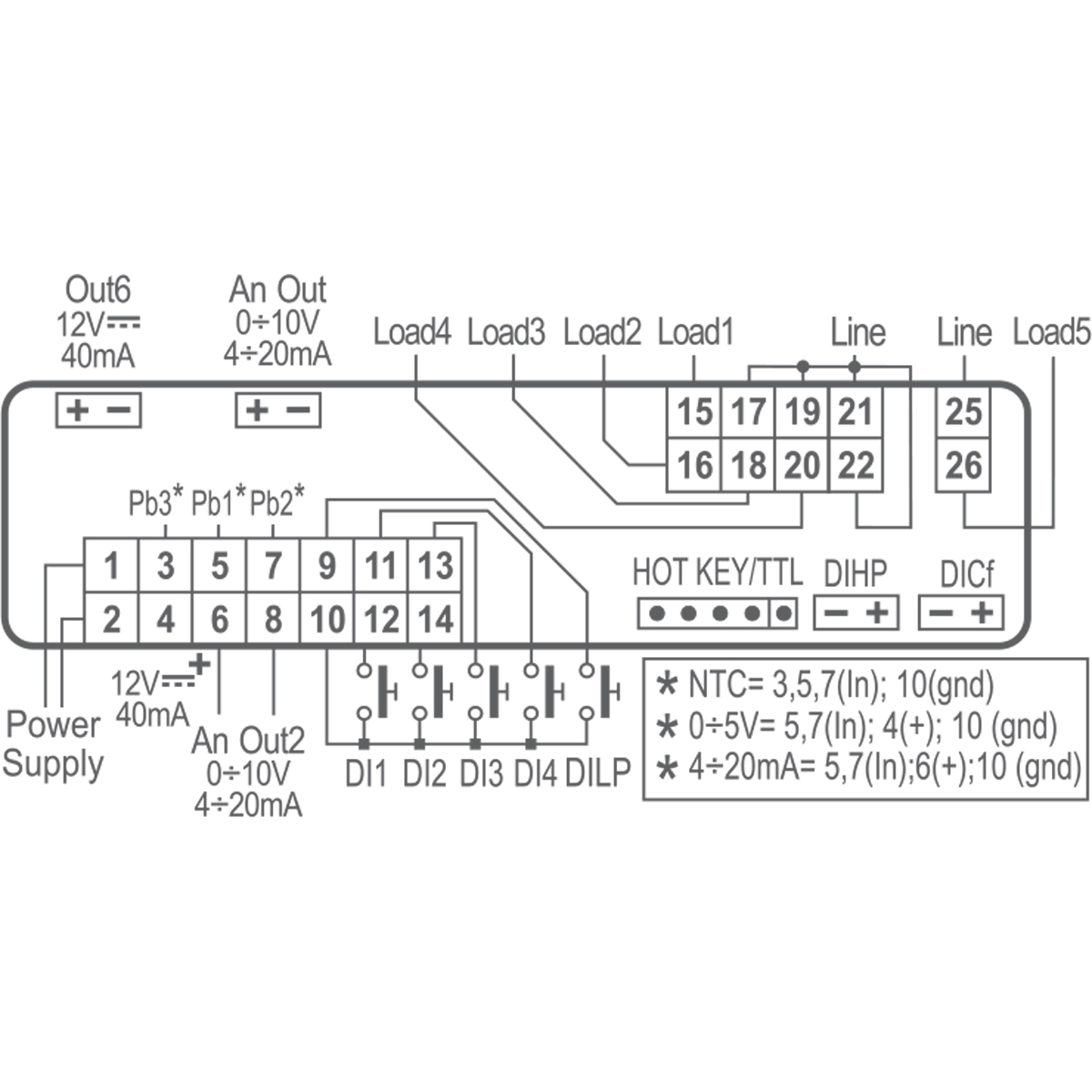 | NTC, PTC, Pt100, TcJ, TcK, TcS, 4÷20mA, 0÷1V, 0÷10V | |