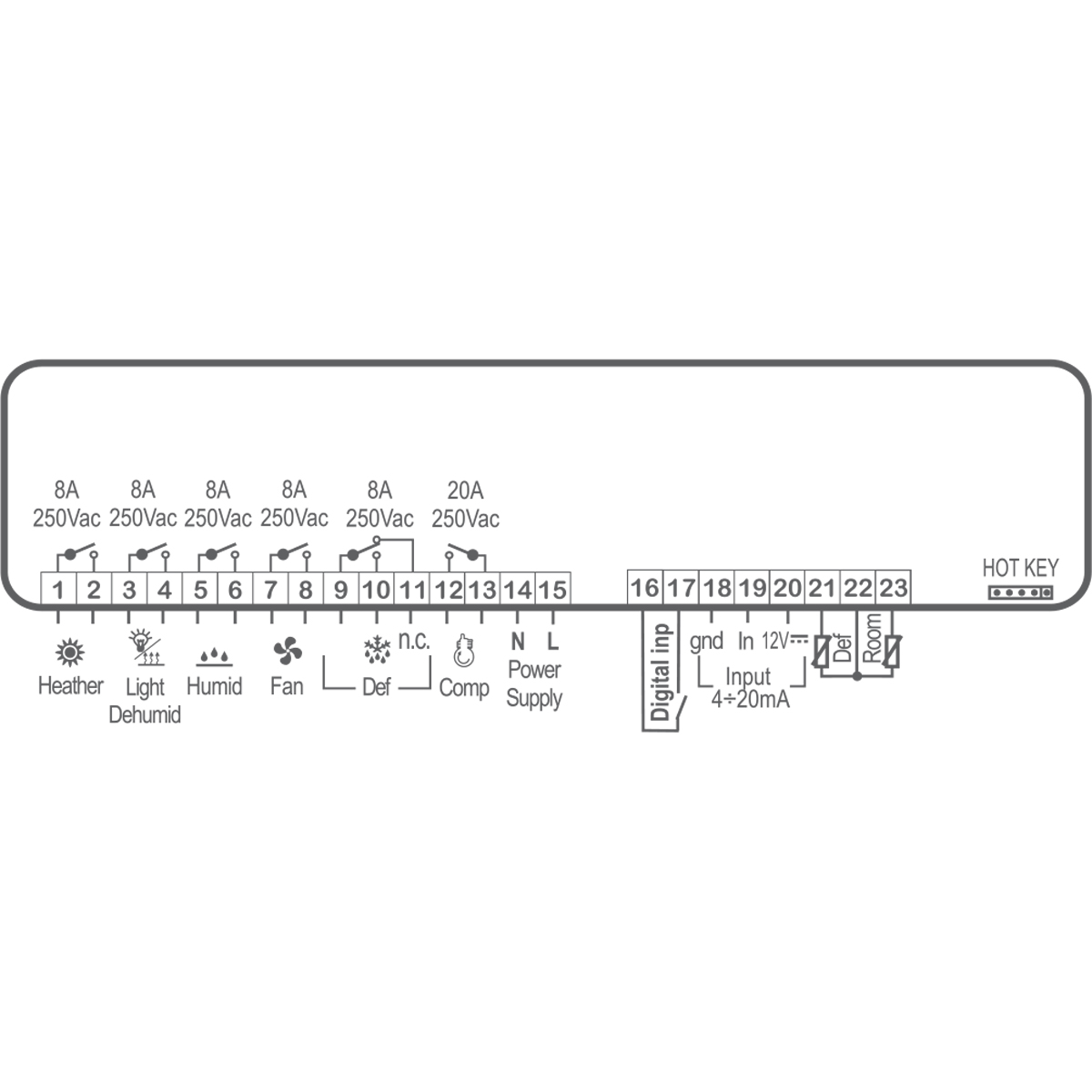 Elektronische Regler mit Steuerung von Temperatur und Feuchte Heizen/Kühlen für Lebensmittelkonservierung Abtaumanagement Möglichkeit, Feuchtesteuerung auszusetzen Entfeuchtung unter Kühlung Programmierbare Ablauf- und Haltezyklen mit verschiedenen Sollwerten (XH300) Programmierbare Zyklen des Ablauftventilators (XH300) Bis zu 8 Tasten mit Direktzugang zu den Hauptfunktionen Direkte Spannungsversorgung 230Vac Einfache und schnelle Programmierung mit Hot Key oder Prog Tool Kit Serielle Verbindung mit Überwachungssystemen Max. Leistungsaufnahme 10VA Doppeltes Display mit roten LED mit 8,0mm Höhe und gelbenLED mit 5,6mm Höhe und 14 Symbolen