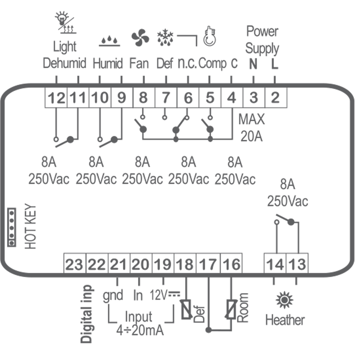Elektronische Regler mit Steuerung von Temperatur und Feuchte Heizen/Kühlen für Lebensmittelkonservierung Abtaumanagement Möglichkeit, Feuchtesteuerung auszusetzen Entfeuchtung unter Kühlung Programmierbare Ablauf- und Haltezyklen mit verschiedenen Sollwerten (XH300) Programmierbare Zyklen des Ablauftventilators (XH300) Bis zu 8 Tasten mit Direktzugang zu den Hauptfunktionen Direkte Spannungsversorgung 230Vac Einfache und schnelle Programmierung mit Hot Key oder Prog Tool Kit Serielle Verbindung mit Überwachungssystemen Max. Leistungsaufnahme 10VA Doppeltes Display mit roten LED mit 8,0mm Höhe und gelbenLED mit 5,6mm Höhe und 14 Symbolen