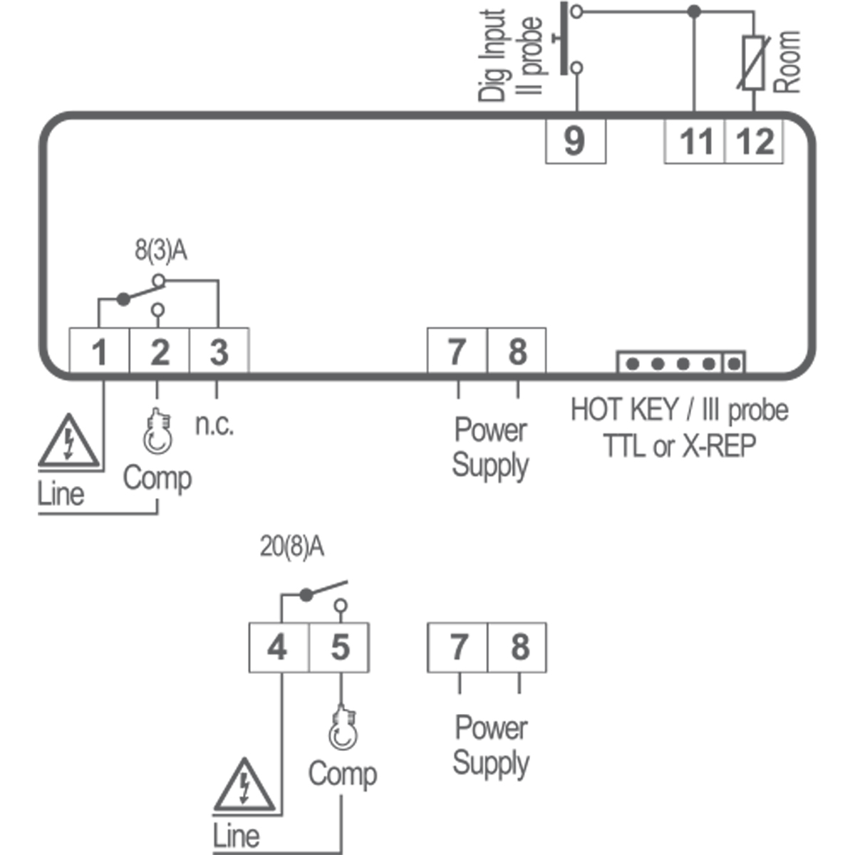 Elektronische Regler für Heizen und Kühlen NK und TK Einfache und intuitive Installation Direkte An/Aus-Taste Energiesparzyklen durch digitalen Eingang Schnellkühlung durch vorbestimmten Sollwert Regelungswiederaufnahme während Türalarm Funktionen max. und min. Temperatur Digitaler Eingang auch als Fühler konfigurierbar Steuerung des virtuellen Fühlers Zyklen für die Kühlung und Lagerung von Milch Funktionen zur Behandlung der Luftfeuchte in Automatisierungsprozessen Regelung der Verflüssigungstemperatur um kritischen Situationen der Anlage vorzubeugen Einfache und schnelle Programmierung mit Hot Key oder Prog Tool Kit Serielle Verbindung zu Überwachungssystemen (direkt für XR35/75/77CX oder per XJ485CX) Verbindung zu X-REP-Fernanzeige (alternativ zu TTL-Ausgang) Leistungsaufnahme 3VA Display mit roten LED mit 10,5mm Höhe und Symbolen