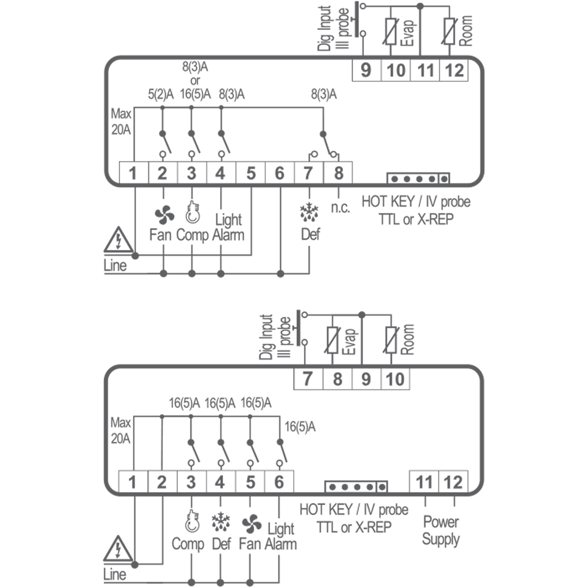 Elektronische Regler für Heizen und Kühlen NK und TK Einfache und intuitive Installation Direkte An/Aus-Taste Energiesparzyklen durch digitalen Eingang Schnellkühlung durch vorbestimmten Sollwert Regelungswiederaufnahme während Türalarm Funktionen max. und min. Temperatur Digitaler Eingang auch als Fühler konfigurierbar Steuerung des virtuellen Fühlers Zyklen für die Kühlung und Lagerung von Milch Funktionen zur Behandlung der Luftfeuchte in Automatisierungsprozessen Regelung der Verflüssigungstemperatur um kritischen Situationen der Anlage vorzubeugen Einfache und schnelle Programmierung mit Hot Key oder Prog Tool Kit Serielle Verbindung zu Überwachungssystemen (direkt für XR35/75/77CX oder per XJ485CX) Verbindung zu X-REP-Fernanzeige (alternativ zu TTL-Ausgang) Leistungsaufnahme 3VA Display mit roten LED mit 10,5mm Höhe und Symbolen