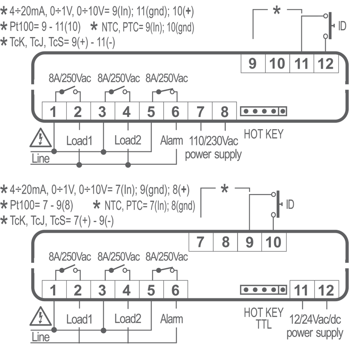 | NTC, PTC, Pt100, TcJ, TcK, TcS, 4÷20mA, 0÷1V, 0÷10V | config |