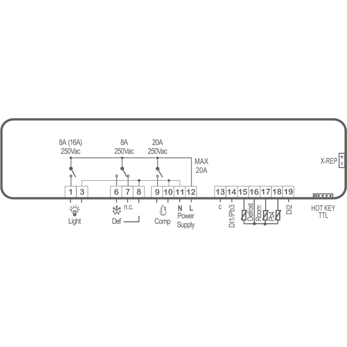 Innovatives und elegantes Design, das die Ästhetik und Funktionalität des Gerätes hervorhebt Direkte Anschlüsse der Verbraucher zur Reduzierung der Verdrahtungskosten Verdichter-Relais (20A) für Leistungen bis 1,2 PS Direkte Stromversorgung mit 230 (110)(24) Vac, kein externer Trafo erforderlich Bis zu 8 Tasten mit Direktzugang zu den Hauptfunktionen Aufzeichnung und Anzeige der Mindest- und Höchsttemperatur Einfache oder modulierende Steuerung von hoher und niedriger Feuchte Intelligente Abtauung Integrierte Energiesparfunktion Dauerzyklus mit vorbestimmtem Sollwert Steuerung des virtuellen Fühlers Einfache und schnelle Programmierung mit Hot Key oder Prog Tool Kit Verbindung mit X-REP Fernanzeige Serielle Verbindung mit Überwachungssystemen Leistungsaufnahme 7VA LED-Display mit 10,5 mm Höhe und Symbolen (13,2mm Formate VS und V)