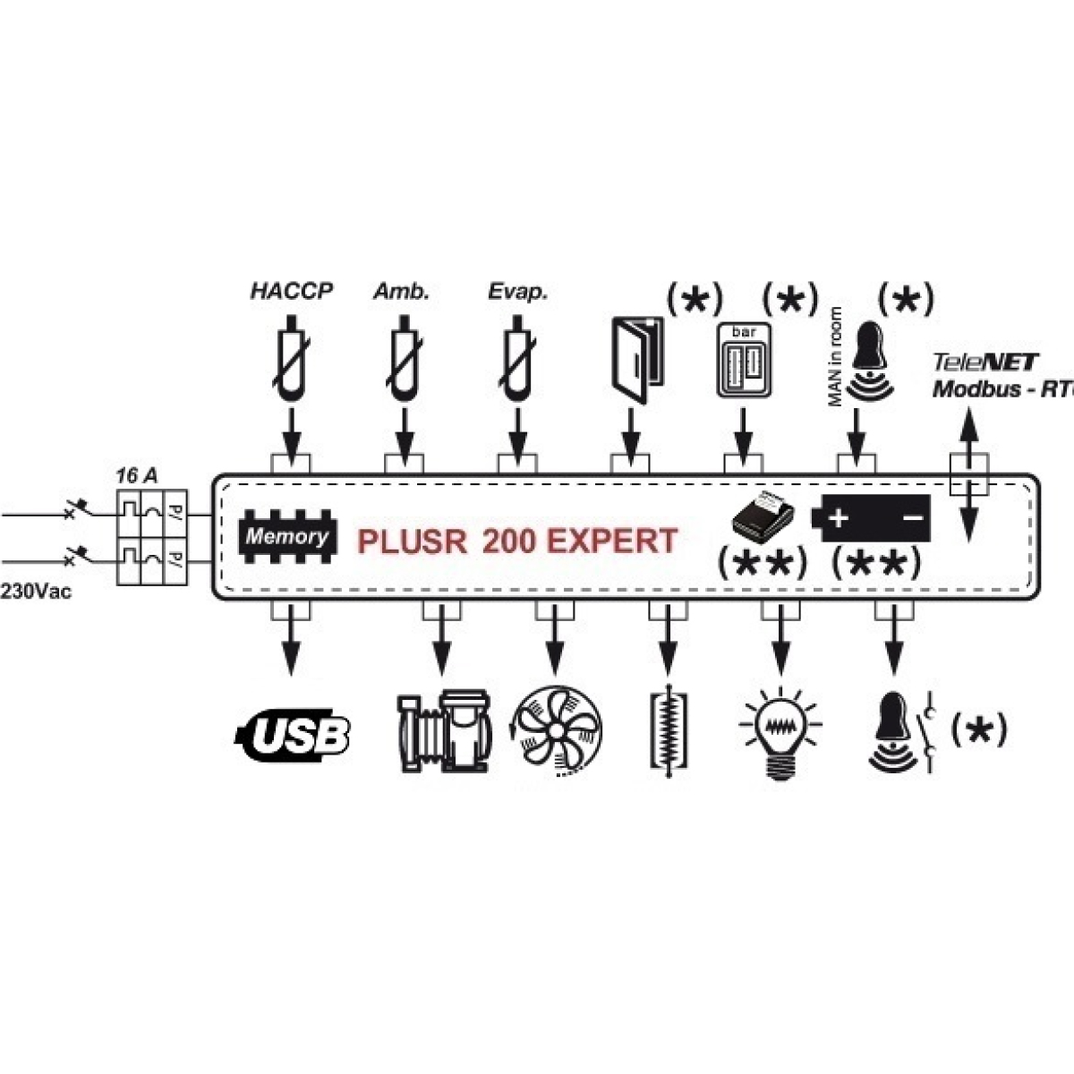 Wechselstromanlagen (230 VAC) Elektrische Abtauung, über Parameter einstellbar. Pump-Down Schaltung möglich Datalogger gem. HACCP Richtlinien Optional können die gespeicherten Daten über ein Bluetooth Modul auf ein Handy oder einen Thermoprint Drucker ausgelesen werden. Pufferbatterie gem EN 378 optional erhältlich.