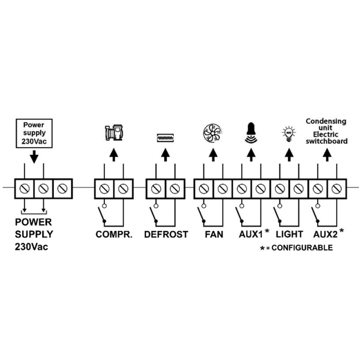Direkte Steuerung des Verdichters, Verdampferlüfter, Abtauheizung, Kühlraumbeleuchtung und zwei potentialfreien Alarmrelais/ AUX. Ansteuerung von EC Motoren direkt möglich