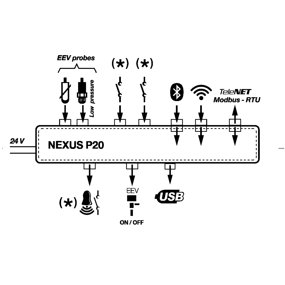 Elektronischer Regler zur Steuerung von ON/OFF- Expansionsventilen mit 230/110/24 VAC oder 24 VDC Spule. Der Regler kann über die MyPego APP oder über ein Remotedisplay (optional) konfiguriert werden.