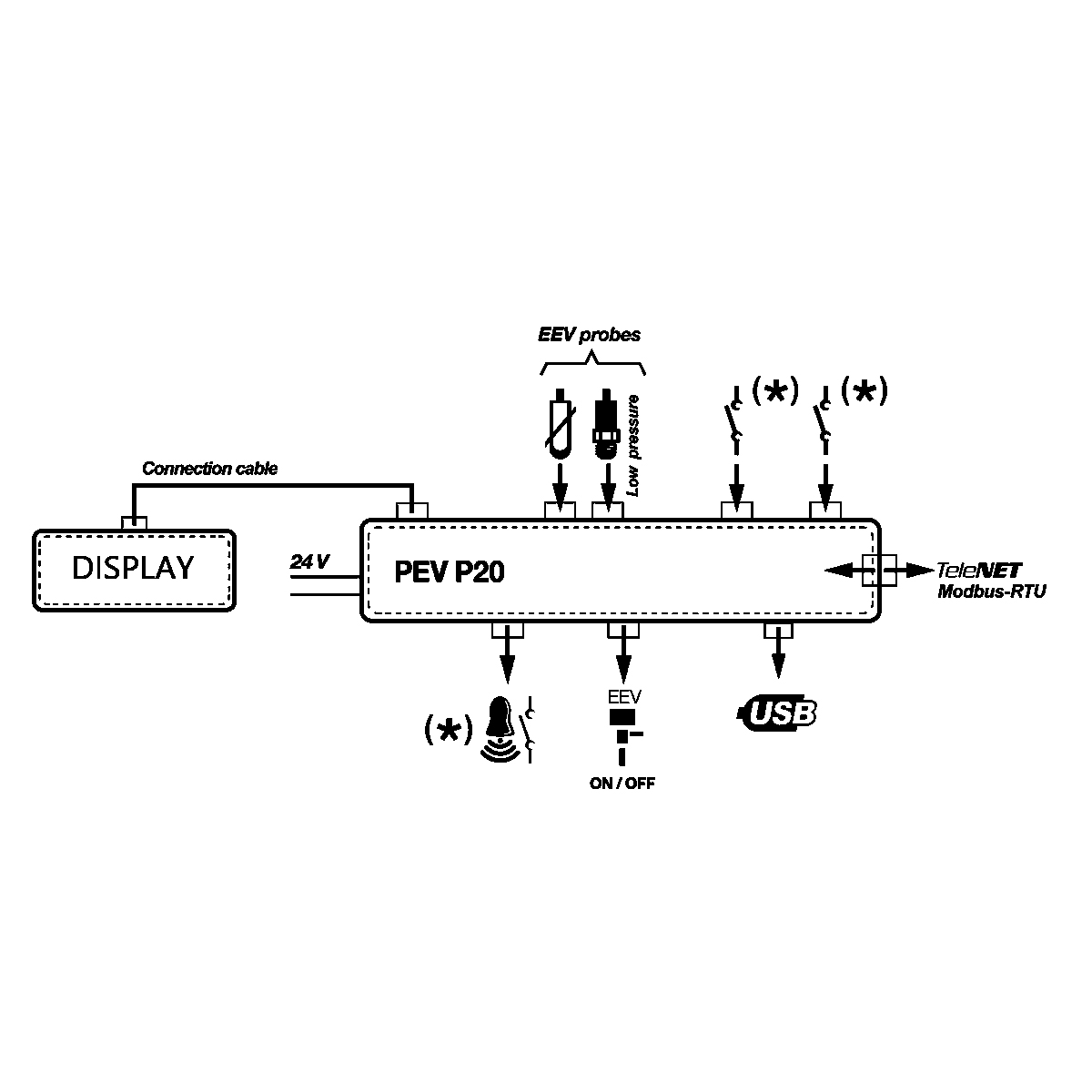 Elektronischer Regler zur Steuerung von ON/OFF-Expansionsventilen mit 230/110/24 VAC oder 24 VDC Spule. Es kann mit einem Remotedisplay (optional) oder dem integriertem Display konfiguriert werden.